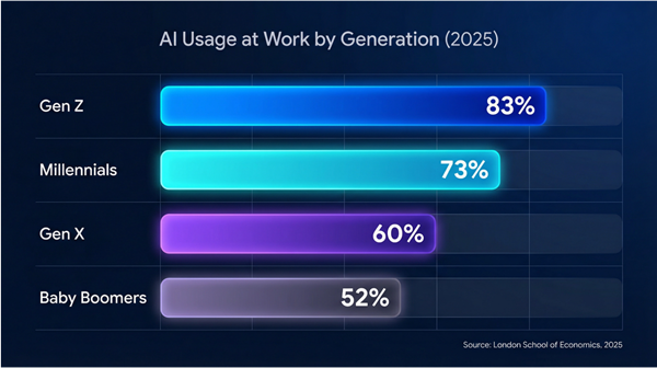 A quiet but profound transformation is reshaping the modern workplace and it is about who truly understands and wields the most powerful business tool of our time: Artificial Intelligence. The data reveals a startling new generation gap. According to a 2025 study from the London School of Economics, a staggering 83% of Gen Z employees now use AI at work, a figure that plummets to just 52% for Baby Boomers.