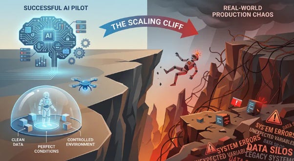 The Scaling Cliff: A successful pilot is a siren’s song, luring you toward the rocks of production. An AI model that works perfectly on a clean, curated dataset will almost certainly fail when exposed to the messy reality of real-world data. An estimated 80% of AI projects never make it past this scaling cliff, dying a quiet death in “pilot purgatory.”