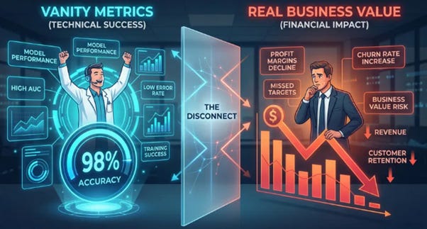 The Vanity Metrics Trap: We celebrate a model’s 98% accuracy in a lab environment, but that metric is meaningless if it doesn’t translate to improved customer retention, reduced operational costs, or increased sales. We have become obsessed with technical performance, forgetting that the only metric that matters to the business is financial impact.